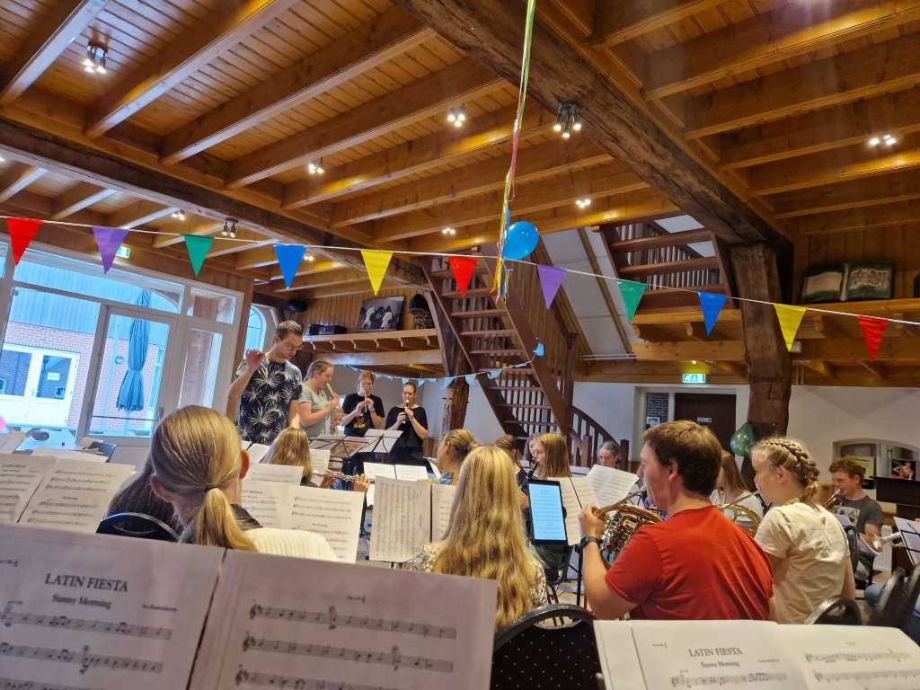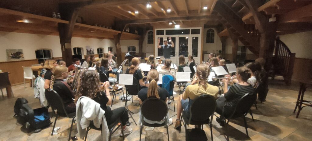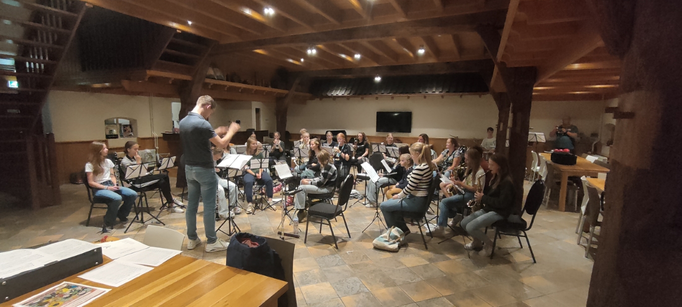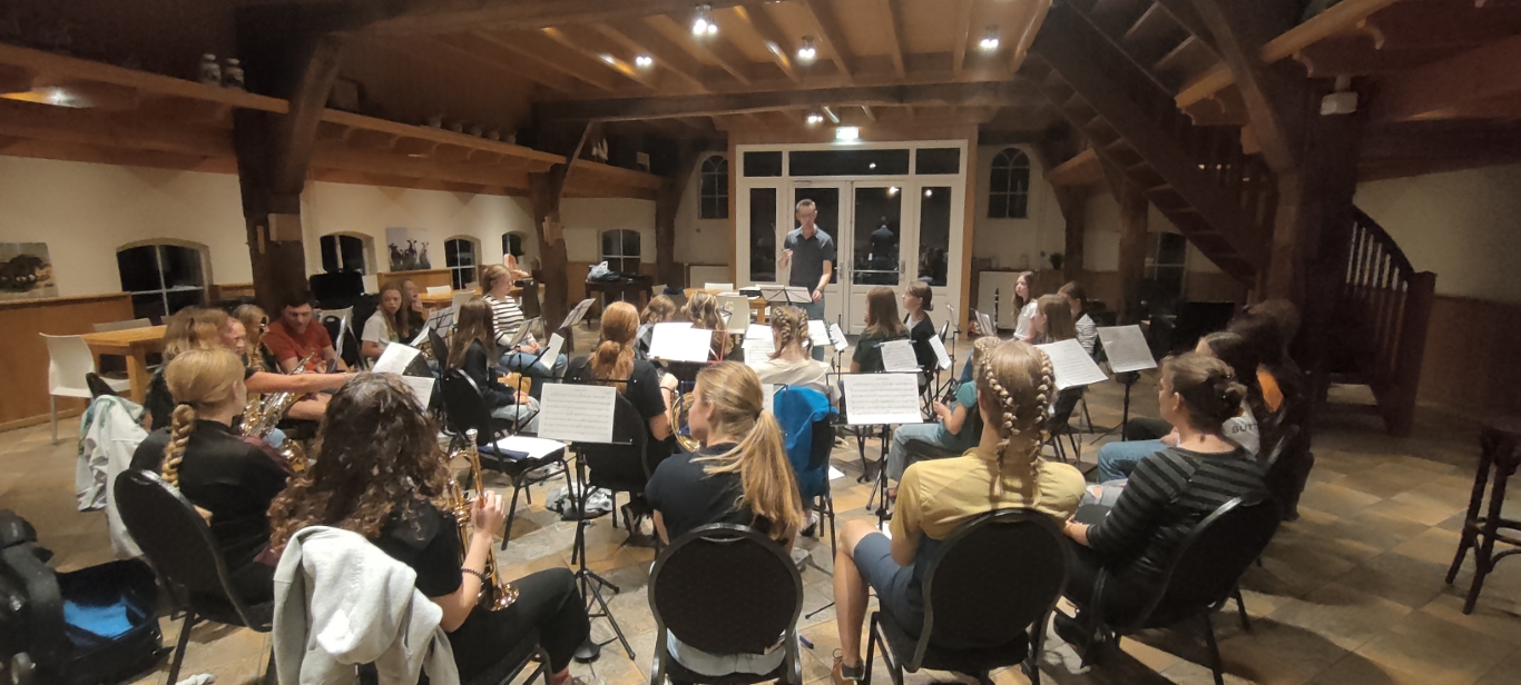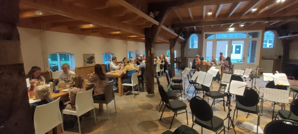 Op zaterdag zijn we na het, voor sommigen wat vroege, ontbijt weer begonnen met repeteren. Deze ochtend hadden we geen dirigent dus zijn alle secties apart aan de slag gegaan. Toen we na het zwemmen en traditiegetrouw pannenkoeken eten weer met ons allen bij elkaar zaten, klonken de stukken ineens veel beter! In de avond volgde weer een gezellige karaokeavond waar zowel jong als oud fanatiek meedeed!