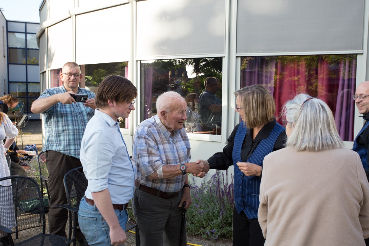 Nadat de mars Stand By en het werk Ammerland gespeeld waren was het tijd om Wim Smale te huldigen met een bronzen medaille en bijhorende oorkonde van het KNMO. Ook werd Wim een mooi bloemstuk aangeboden gemaakt door de vrouw van รฉรฉn van onze leden. Het was een mooi en ook een emotioneel weerzien. Na de huldiging werd de mars Jublissimo ten gehore gebracht. Na afloop werd er tijd gemaakt om samen nog even na te praten en herinneringen op te halen onder het genot van een kopje koffie of thee.